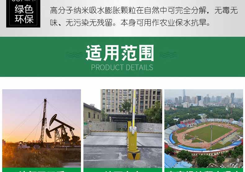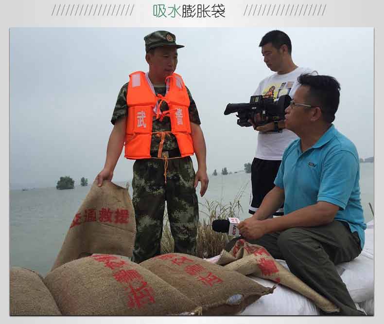 采用以水治水的新理念:在防汛搶險緊急時刻無處尋找砂石土料,可以將吸水膨脹袋放入水中,3分鐘可迅速膨脹到20-25公斤,代替人工裝沙填土的防汛沙袋時代,也可以直接將吸水膨脹袋投放到管涌口,快速封堵堤壩管涌,廣泛用于防洪搶險,堤壩管涌,河堤堵漏,堤防漏洞、漫溢搶護,防洪堤防的臨時性加高,臨時性防水圍城的構筑,水庫,江河大堤滲水滑坡,護坡防沖,工程截流,暗溝和暗洞的堵塞。用于庫房,庭院,溝塘,被淹耕地排水;用于容易淹水的工廠,隧道,地下停車場,地鐵等領域作為防落水的使用;用于市政設施、道路施工,工地橋梁建設,競賽場地等積水處吸水去水。是我國各地水利,水務,防汛辦,防汛物資儲備及市政排水,和城市易澇區必備的應急防汛儲備物資。