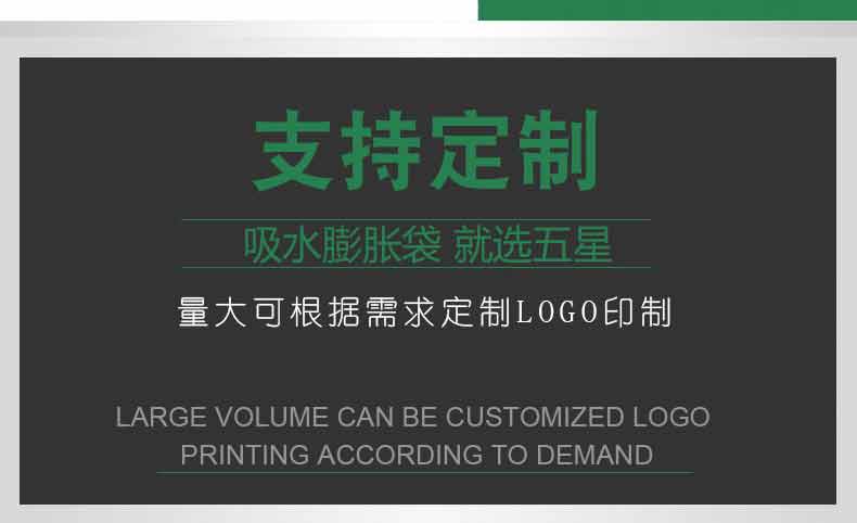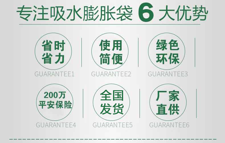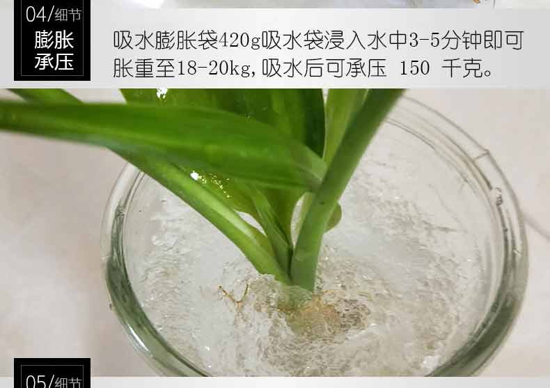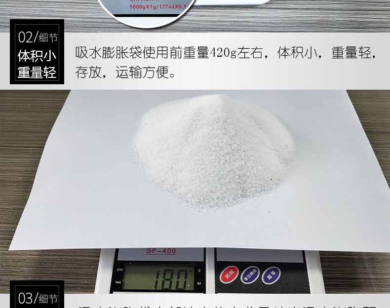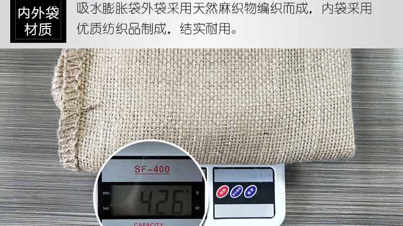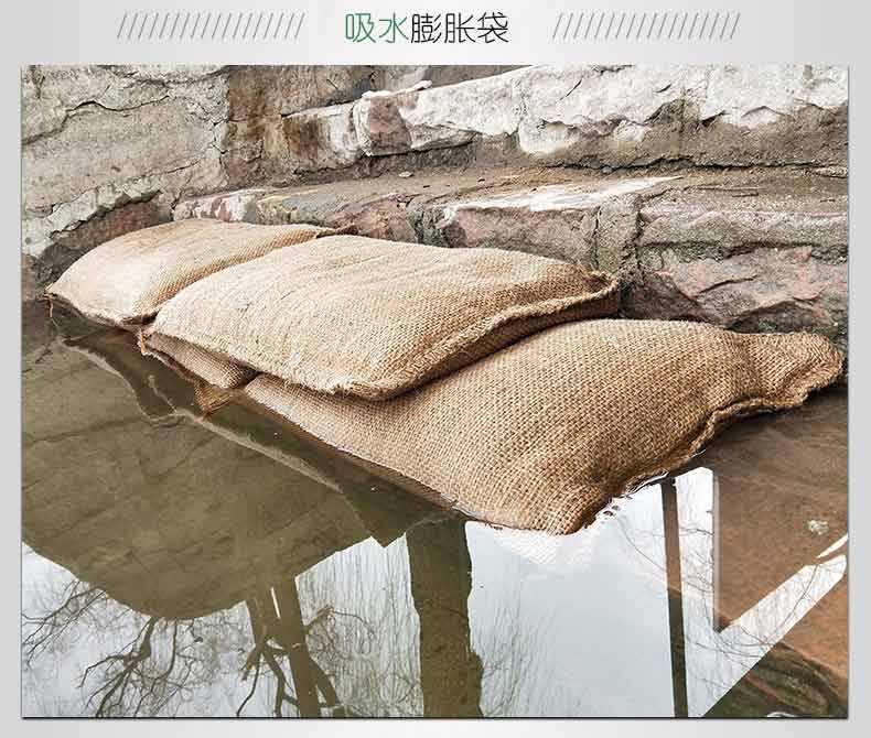 吸水膨脹袋內裝的是新型的高分子納米吸水物質,這種物質無毒、無味、無污染,吸水膨脹前為極小的顆粒物質,吸水后為黑豆大小的含水物質,干凈且無公害,待高分子吸水物質使用后可用于農業保水抗旱,所以在洪水過后可就地將袋內的物質傾倒入農田中,在泥土中可完全分解,是綠色環保、一舉兩得的首選產品。外袋為純麻布和棉布織成,遇水后麻繩可更加結實耐磨。