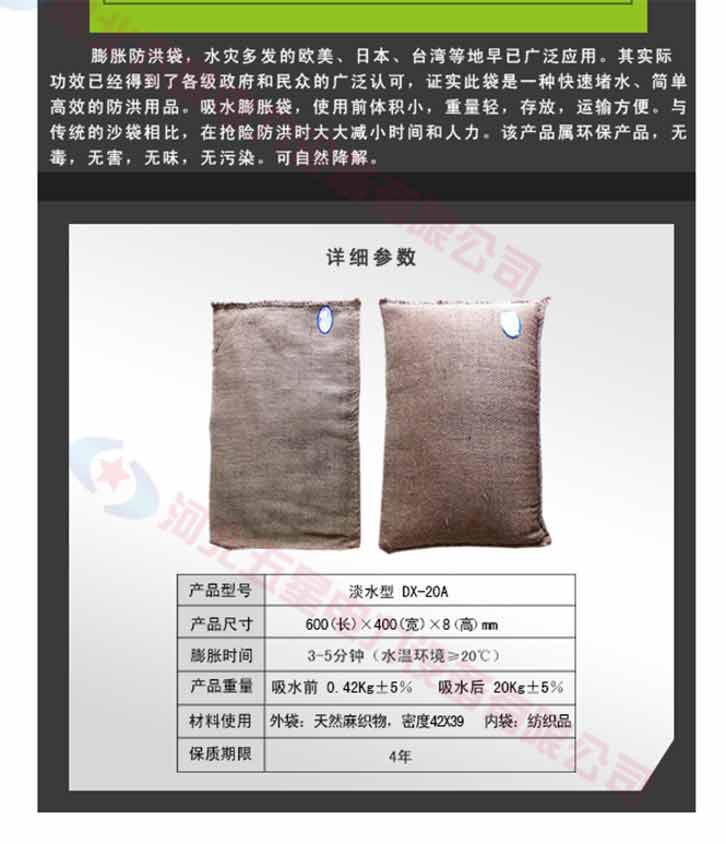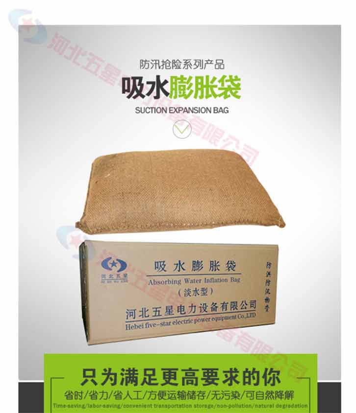 膨脹防洪袋,使用前體積小,重量輕,存放,運輸方便。與傳統(tǒng)的沙袋相比,在搶險防洪時大大減小時間和人力,另防洪搶險更有效率。吸水膨脹袋屬環(huán)保產(chǎn)品,無毒,無害,無味,無污染。可自然降解。